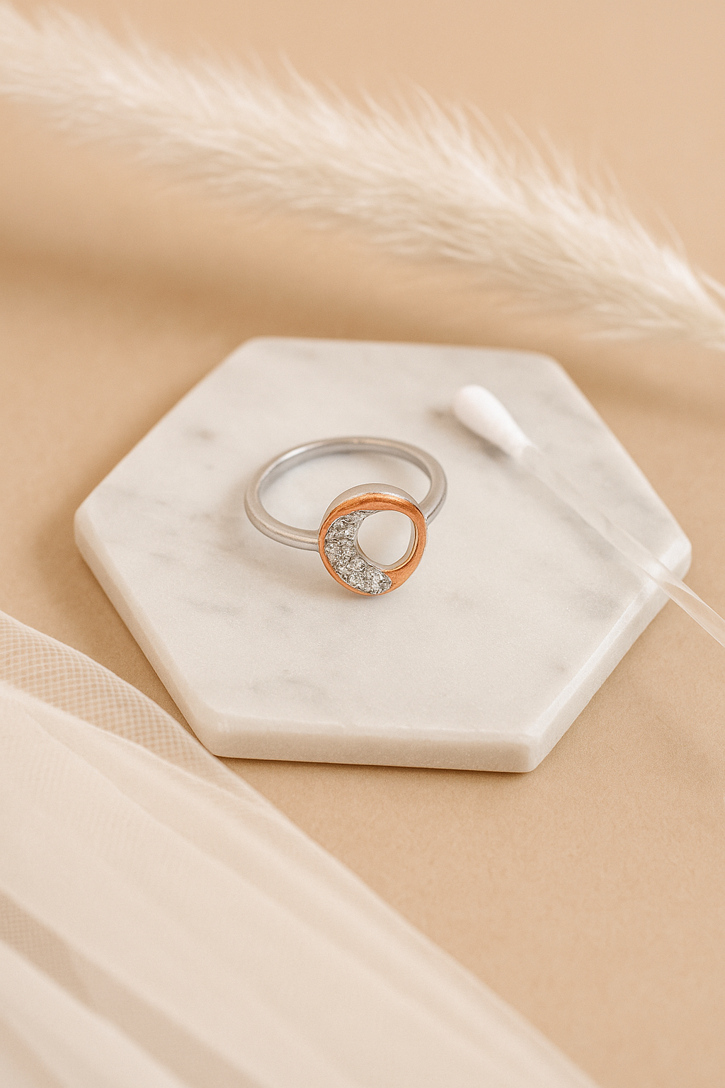 Elevate your everyday style with this The Orbit Bling ring, crafted from premium 925 sterling silver. The unique open circle design is beautifully accented with rose gold plating on one side and sparkling cubic zirconia on the other, symbolizing harmony and balance.