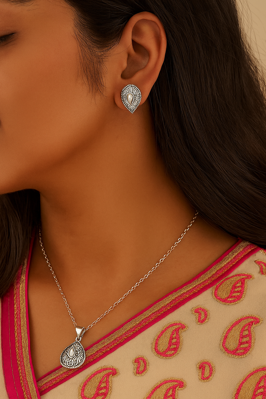 Crafted in oxidised silver with ornate detailing, this pendant set embodies timeless elegance. The paisley motif adorned with a teardrop stone brings out an ethnic charm, making it perfect for pairing with sarees, lehengas, or Indo-western attire.