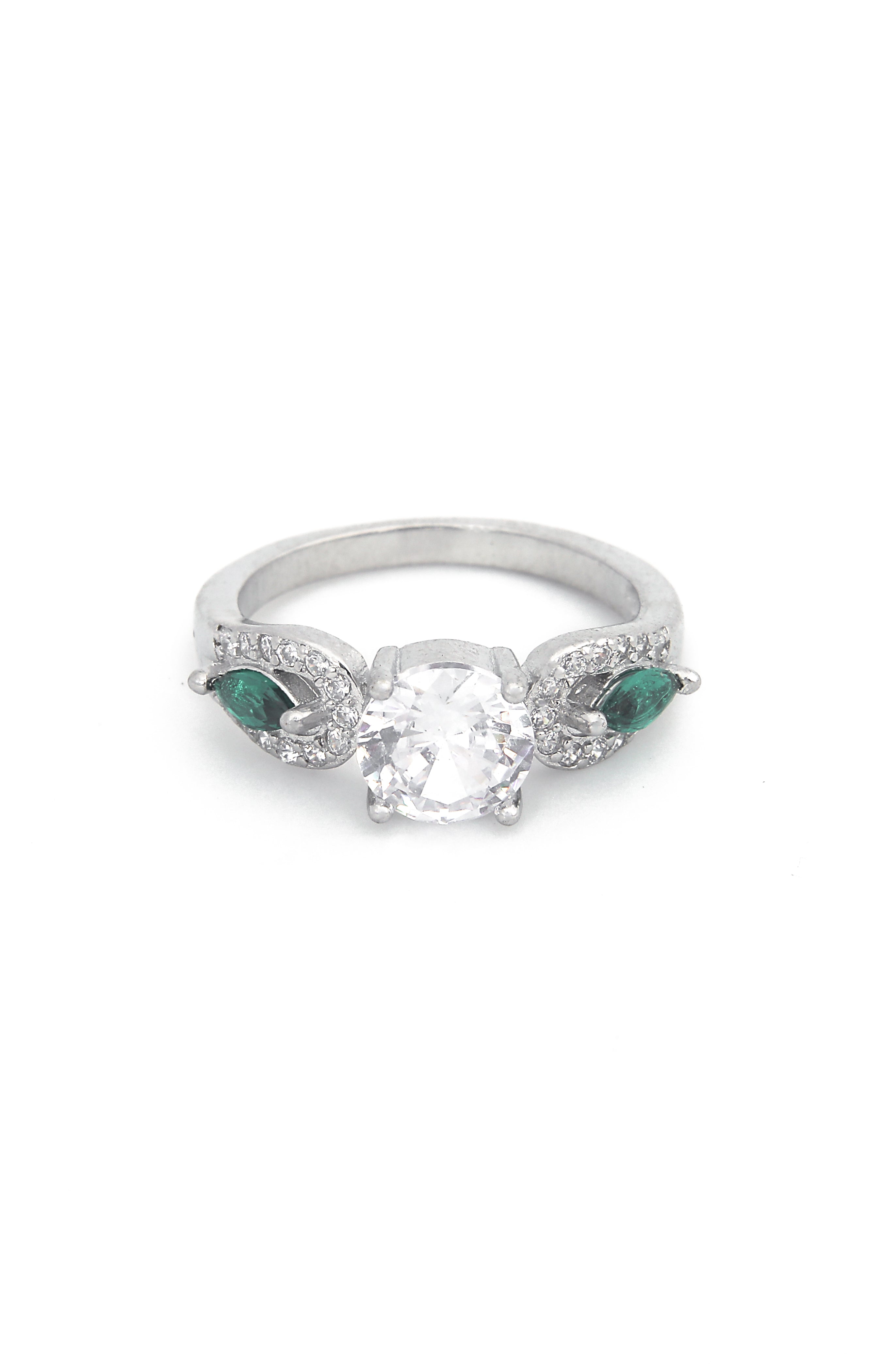 Delicate and enchanting, this sterling silver ring features a brilliant round-cut center stone flanked by marquise-cut emeralds nestled in leaf-like pavé settings. The Emerald Leaf Spark Ring captures the essence of nature’s elegance with a refined, timeless sparkle—perfect for graceful hearts and green-loving souls.