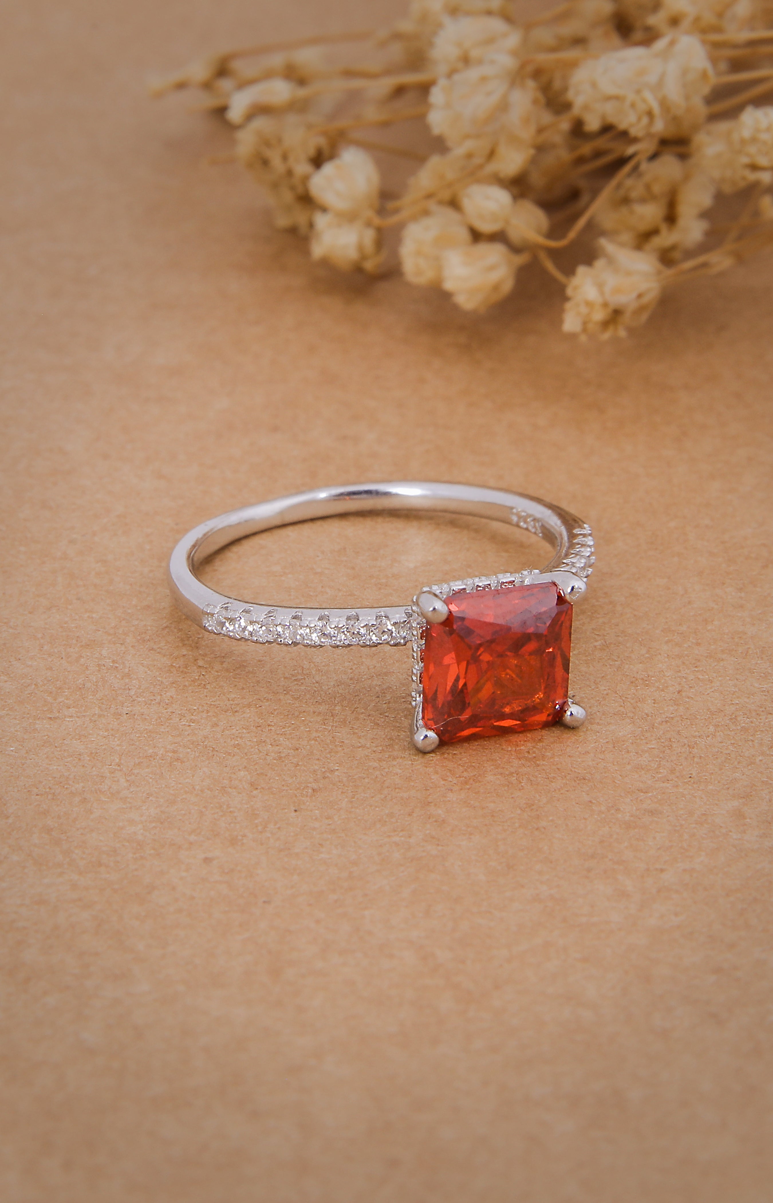 Striking and sophisticated, this sterling silver ring features a radiant emerald-cut red gemstone, flanked by a pavé-set band that adds a touch of brilliance. The bold scarlet center stone symbolizes power and passion—perfect for making a confident and elegant statement.