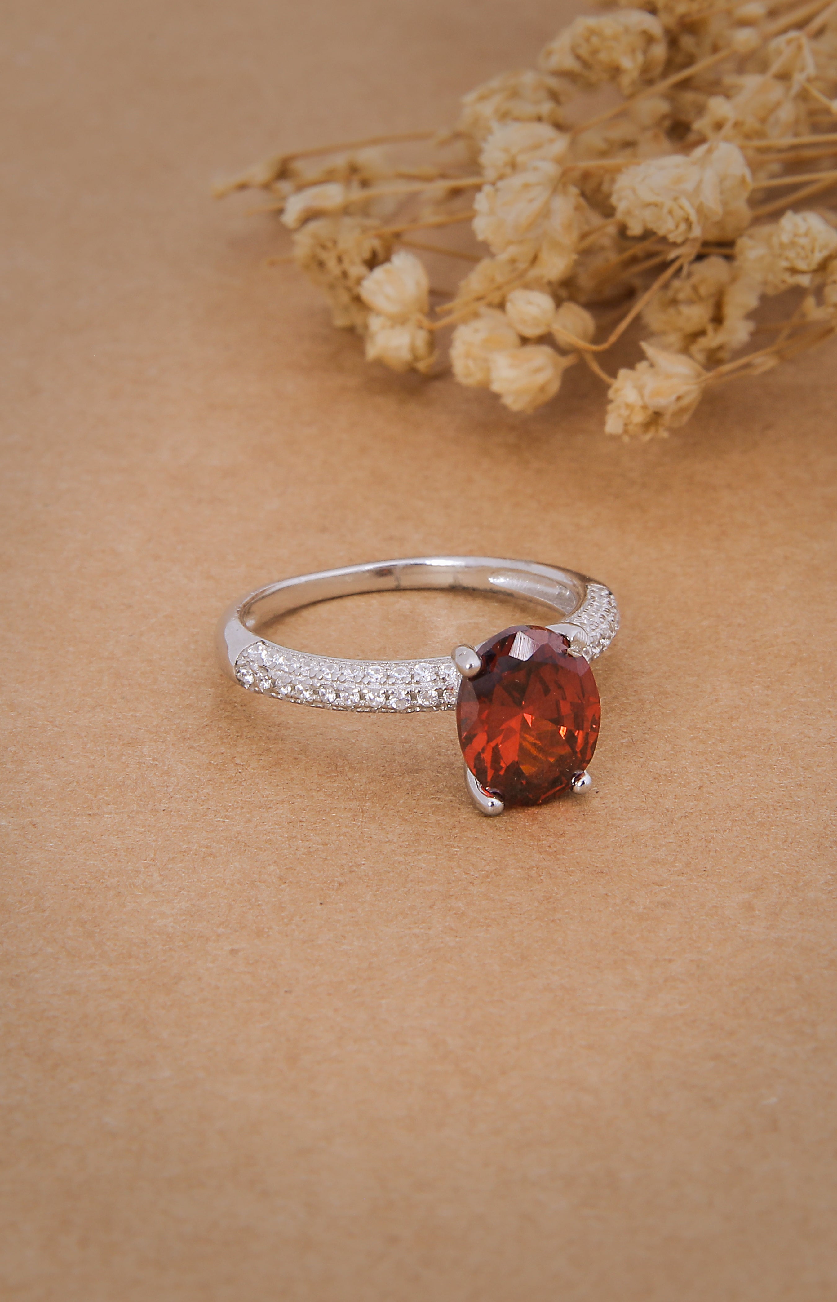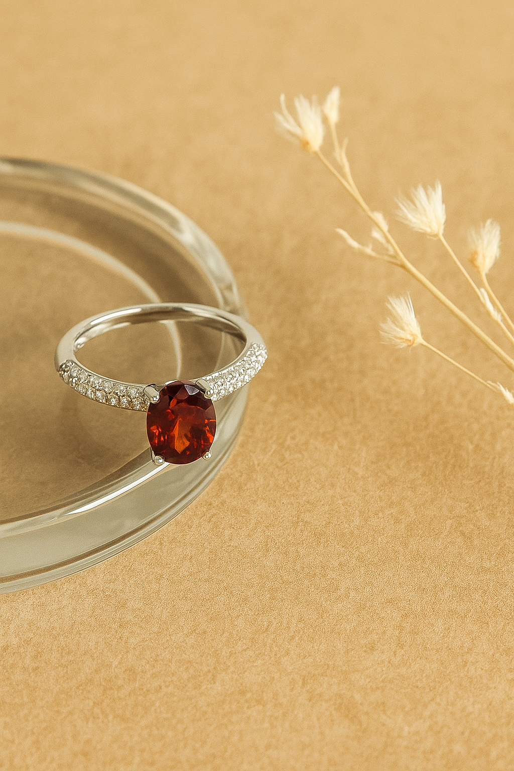 Bold and elegant, this sterling silver ring showcases a deep red round-cut gemstone at its center, symbolizing passion and strength. Flanked by a shimmering pavé band, the Crimson Ember Solitaire Ring radiates timeless glamour—perfect for statement moments or everyday sophistication.