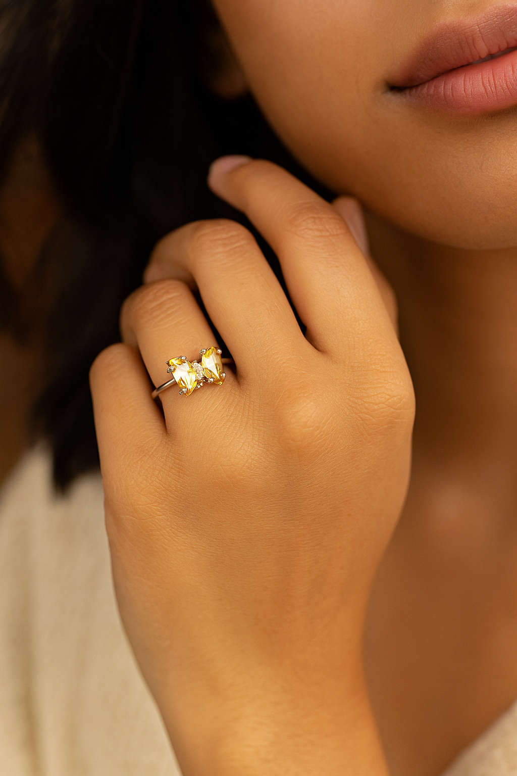Bright and uplifting, this sterling silver ring features twin yellow gemstones sculpted into delicate butterfly wings, centered with a cluster of sparkling stones. A radiant symbol of joy and renewal, it adds a sunny, graceful charm to your jewelry collection.